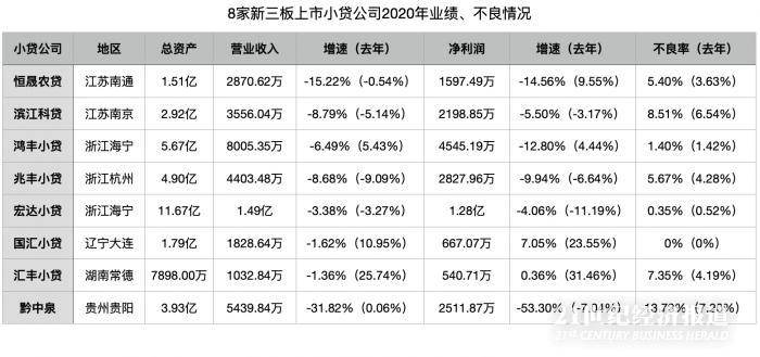 21世纪经济报道记者梳理新三板上市的8家小贷公司2020年业绩报告发现,营业收入全部负增长,净利润6家负增长,而与2019年相比,绝大部分增速出现下滑,个别降幅超过30个百分点。