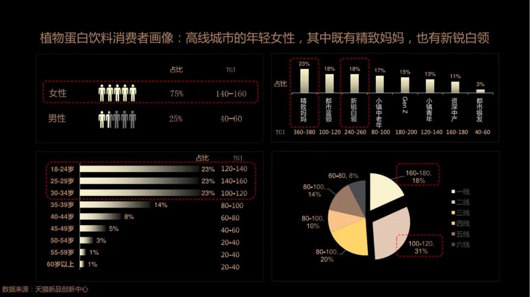 从身份来看,高线城市的精致妈妈、年轻白领对“植物基”概念的接受程度更高。一方面,体面的生存质量和社会身份让这些精英人士更易接受植物蛋白饮品的高溢价。另一方面,一二线消费者对健康的执念更深,相对于“口味”,“天然”更适合成为他们的购买关键词。