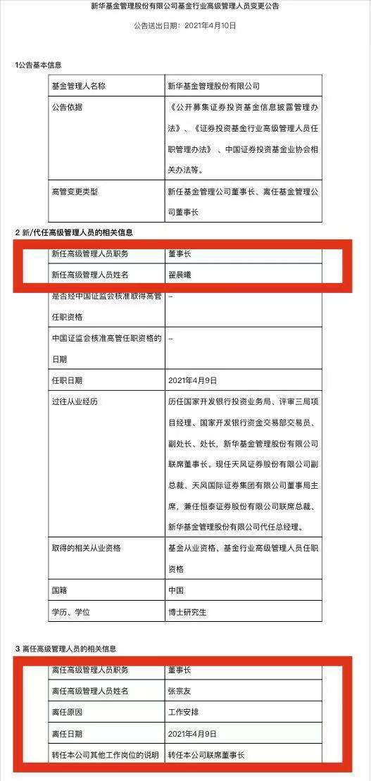 而在4天前,翟晨曦履新新华基金董事长,原董事长张宗友转任联席董事长,任职时间2021年4月9日。