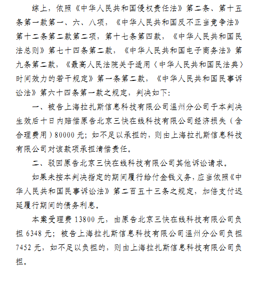 另外,上述行为还会导致消费者从多个外卖平台获得产品和服务的渠道丧失,使消费者的选择权严重受限,并且也会扰乱公平、有序、开放、包容的互联网竞争秩序。因此,拉扎斯公司温州分公司(饿了么)的上述行为,属于反不正当竞争法第十二条第二款第二项规定的不正当竞争行为,损害了原告的合法权益,应承担相应的民事责任,需在判决生效后十日内赔偿原告北京三快在线科技有限公司(美团外卖)经济损失(含合理费用)80000 元。