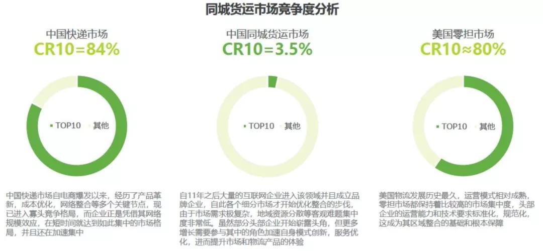 而艾瑞咨询的数据则显示,以B端用户为主体的同城货运市场的离散度极高,宛如一片沙海——中国同城货运Top10玩家的份额仅仅只有3.5%,可以类比的是,快递市场的前十大玩家占据了84%的市场份额,美国零担市场的CR10也达到了八成以上。