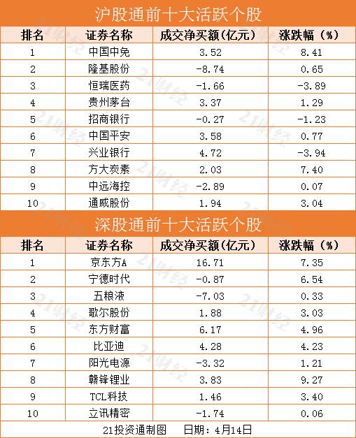 十大活跃个股方面,北向资金大幅买入这些股票:京东方A、东方财富、兴业银行、比亚迪净买入居前,分别获净买入16.71亿元、6.17亿元、4.72亿元、4.28亿元。