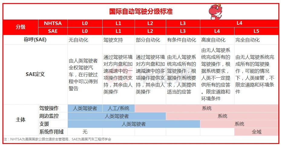 针对自动驾驶不同功能分级,目前国际公认的汽车自动驾驶技术分级标准分别由美国高速公路安全管理局(NHTSA)和国际自动机工程师学会(SAE)所提出,其中SAE提出的分级标准为主流常用标准。