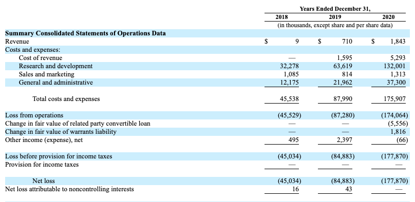 据招股书中显示,2018年至2020年这三年中,图森未来分别营收9000美元、71万美元、184.3万美元,但净亏损分别为4503万美元、8488.3万美元、1.77亿美元。