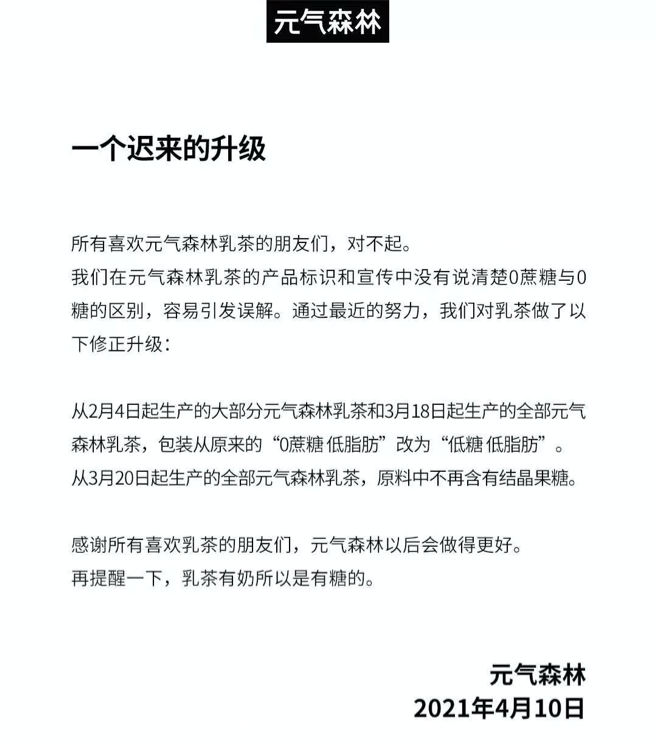 4月10日,元气森林公众号发布《一个迟来的升级》致歉声明,称其在乳茶产品的产品标示和宣传中,没有说明“0蔗糖”与“0糖”的区别,容易引发误解,将对乳茶产品做修正升级,包装从原来的“0蔗糖 低脂肪”改为“低糖 低脂肪”。