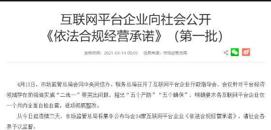 昨日,市场监管总局集中公布互联网平台企业《依法合规经营承诺》(第一批),包括$百度(BIDU.US)$、$京东(JD.US)$、美团、字节跳动、奇虎360、新浪微博、叮咚买菜、$拼多多(PDD.US)$、小红书等企业。
