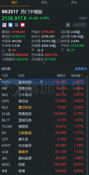 热门中概股周三收盘涨跌不一,区块链概念股和新能源汽车概念股普跌。富途热门中概股板块中,有18只上涨,23只下跌。