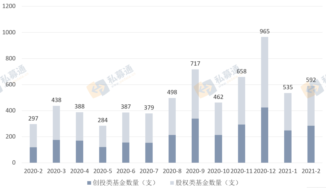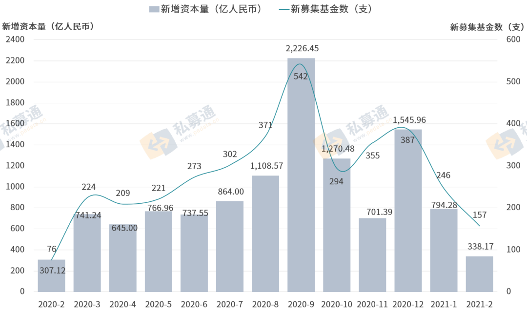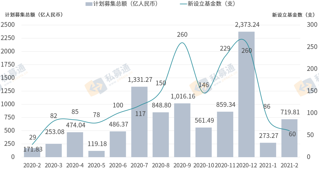 图 2 2020年2月至2021年2月基金设立情况月度走势图