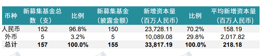 从基金币种来看,2月新募集的基金中,人民币基金与外币基金表现相当,基金数量与规模持续下降。