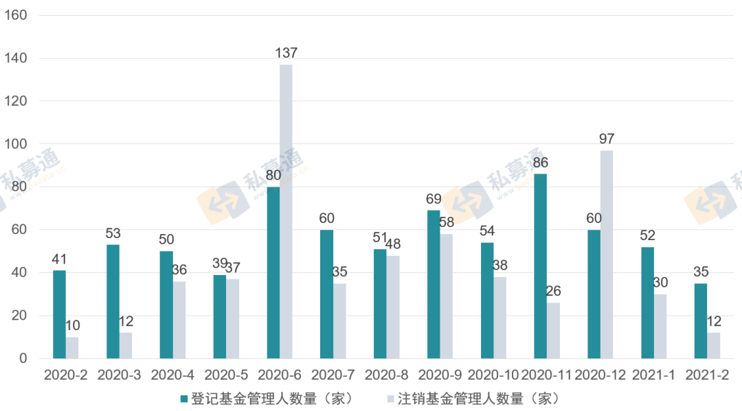 图 6 2020年2月至2021年2月基金管理人登记注销情况月度走势图