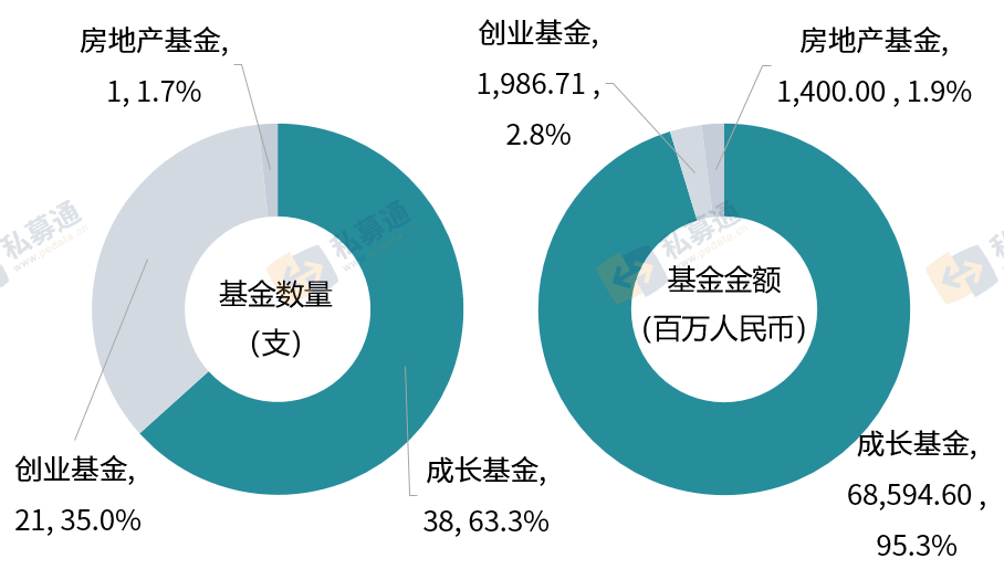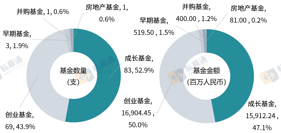 从基金类型来看,成长基金在数量与金额规模上仍保持绝对优势,共新募集83支基金,占比达到52.9%,募集金额159.12亿人民币。