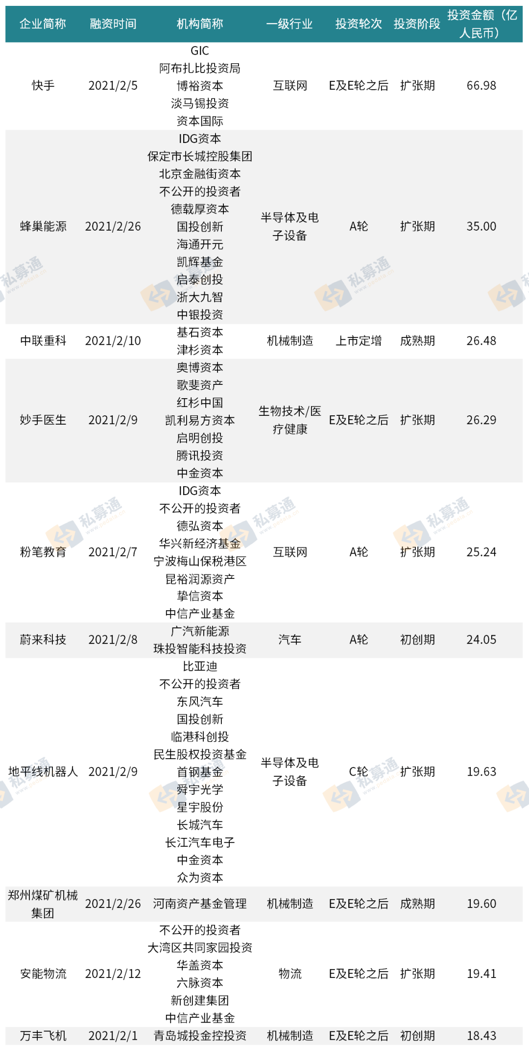表8 2021年2月中国VC/PE市场投资活跃机构