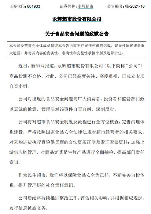 永辉超市发布致歉公告,近日,新华网报道,公司商品检测不合格,对此,公司已经高度关注、高度重视,已成立专项自查小组。公司对出现的食品安全问题向广大消费者、投资者和监管部门致以真诚的歉意,管理层对该事件自查自纠,深刻反省;将对超市食品安全制度及流程进行全方位核查,对商品尤其是生鲜产品进行全面抽检,提高部门责任意识。