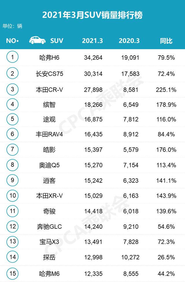 如果说2月的SUV市场发生"巨变",那么3月则一如既往。哈弗H6再次夺回月度"销冠",长安CS75只能屈居第2,本田CR-V依旧排名第3,但缤智由第15跃升至第4,途观由第4降至第5。