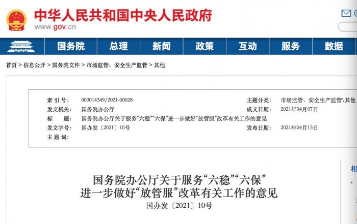 4月15日,国务院办公厅发布《关于服务“六稳”“六保”进一步做好“放管服”改革有关工作的意见》,深化“放管服”改革,打造市场化法治化国际化营商环境,切实做好“六稳”、“六保”工作,推动高质量发展。