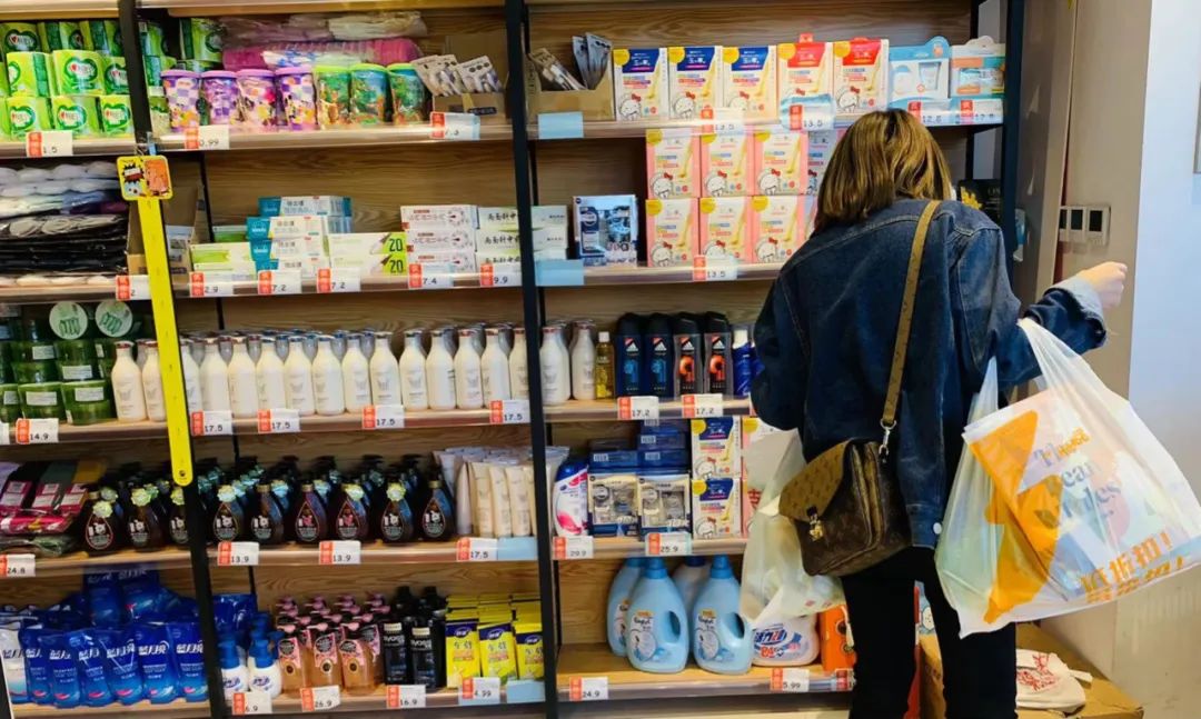 消费者三三两两进入门店,多以年轻人为主。除了购买零食、饮料还会囤一些洗发水、面膜、纸巾等日化用品。没一会儿收银台就排起了队,几乎所有人都拎着一大包商品出店。