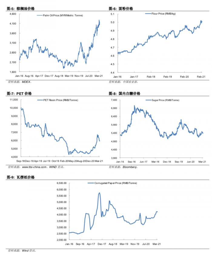 值得注意的是,随着疫情受控与原材料价格上涨,康师傅这种增长势头很难持续。从年初至3月末,棕榈油价格同比增长 3.4%,PET 价格同比增长 22.9%,白糖价格同比增长 3.1%,面粉价格同比上涨 1.5%。棕榈油价格自 2020 年 4 月以来强劲反弹,而且预计将由于季节性减产以及不利的供需关系而在 2021 年保持波动。