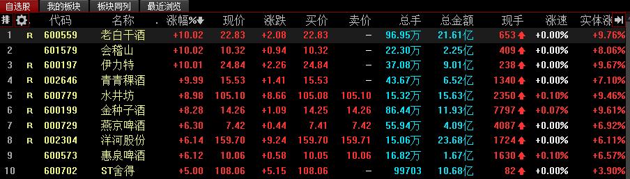 当贵州茅台消息刷屏股市同时,今日酿酒板块集体大涨,带动了市场情绪回暖。