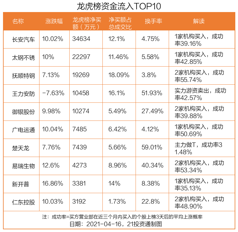 4月16日,上证指数上涨0.81%,深证成指上涨0.3%,创业板指下跌0.26%。盘后龙虎榜数据显示,共有40只个股因当日异动登上龙虎榜,资金净流入最多的是长安汽车(000625.SZ),达3.46亿元。