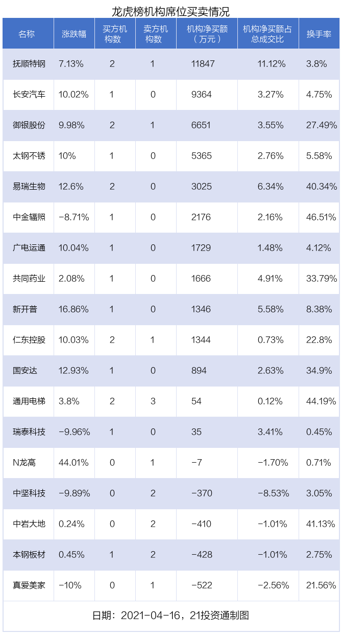 其中,机构净买入金额最多的是抚顺特钢(600399.SH),当日收盘上涨7.13%,换手率为3.8%。前五大买卖营业部中有3家机构,为买一,买四,卖二,合计净买入1.18亿元,占总成交金额的11.12%。