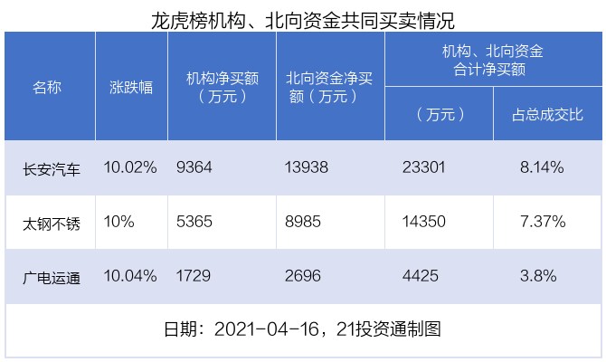 值得注意的是,机构和北向资金共同净买入了长安汽车、太钢不锈、广电运通等3股。