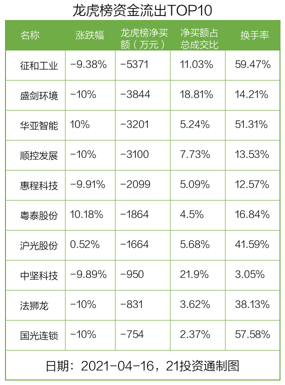而龙虎榜中资金净流出最多的是征和工业(003033.SZ),被净卖出为0.54亿元,占总成交金额的11.03%。征和工业收盘下跌9.38%,换手率为59.47%。
