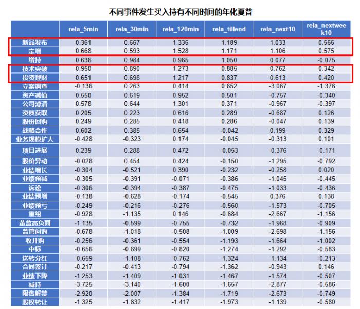 从效果来看,部分标签呈现出比较好的超额收益,部分呈现了较大负的收益,部分则没有明显的特征。这里面红框重点标识的几个事件类型:新品发布,定增,技术突破,投资理财则在不同的持有周期都有比较好的超额收益。这是飞笛科技去年做的事情之一。