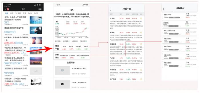 比如这条讲5G的新闻内容,当它有了5G这个主题标签后,就能关联到5G主题概念页。在这个概念下,能够继续关联到其他相关新闻内容、科普投教内容、以及关联到股票,基金等。通过标签,将突发新闻事件关联到内部其他产品,就能够打通内部产品整体的运营链路。这个是我们(飞笛科技)在3年前做的事情。