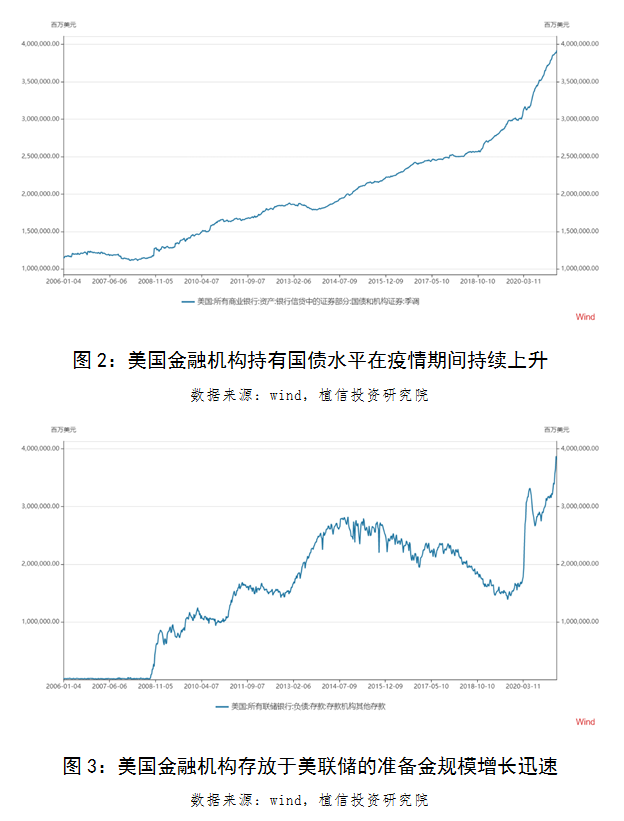 在负债端规模激增和市场风险导致可配置资产有限的双重压力下,美国商业银行对国债和准备金等无风险资产的配置规模出现大幅上升(如图2所示)。数据显示,美国所有商业银行资产端国债和机构证券持有规模从2020年3月初的3.1万亿快速增长至2021年3月底的3.95万亿,一年内增长幅度高达27.4%。而商业银行存放在美联储的准备金自2020年3月后也出现了跳升,从2020年3月的1.7万亿增长至2021年3月的3.8万亿水平,涨幅123%。