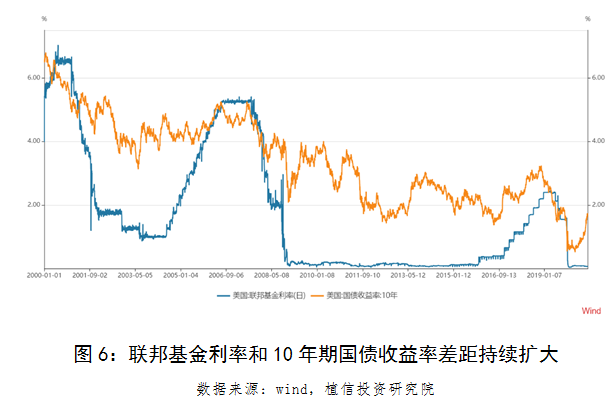 值得注意的是,由于低利率和量化宽松政策的继续施行,同时国债收益率大幅上行,作为美联储货币政策基准的联邦基金利率和作为长期借贷基准的10年期国债收益率之间的差距正在扩大(如图6),这将会促使银行机构产生“借短贷长”动力,从而逐步形成期限错配的系统性金融风险。未来出于控制系统性风险的需要,美国货币当局有可能会推动类似SLR的监管措施逐步退出。