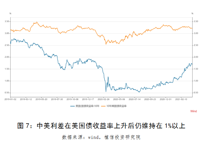 由于我国经济基本面良好,SLR豁免政策退出对我国宏观经济和政策的负面影响基本可控。当前,中美国债利差在美债收益率大幅上升后依然维持在1.5%左右(如图5)的较高水平,中国经济内生增长动力较强,不存在资本大幅流出的基础性环境。短期内部分资本会因为美债收益率上升而回流美国市场,但其会在一定程度上被汇率的短期波动所消化。人民币兑美元汇率在2021年2月升至阶段性高点后以伴随美元指数反弹而逐渐走低,2月初以来已累计贬值2%左右。人民币短期贬值增加了人民币汇率的弹性,有利于对冲可能出现的资本流出预期。