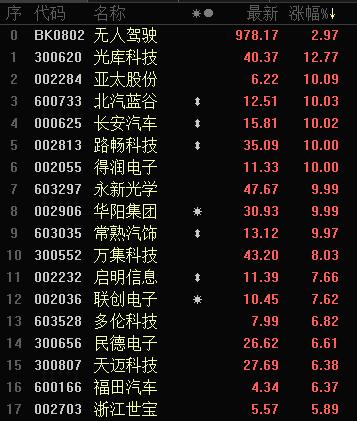 而无人驾驶板块也有多只个股涨停,这主要是因为华为公布了自动驾驶演示视频。华为轮值董事长徐直军表示,华为自动驾驶技术比特斯拉好多了。消息刺激之下,板块个股集体走强。