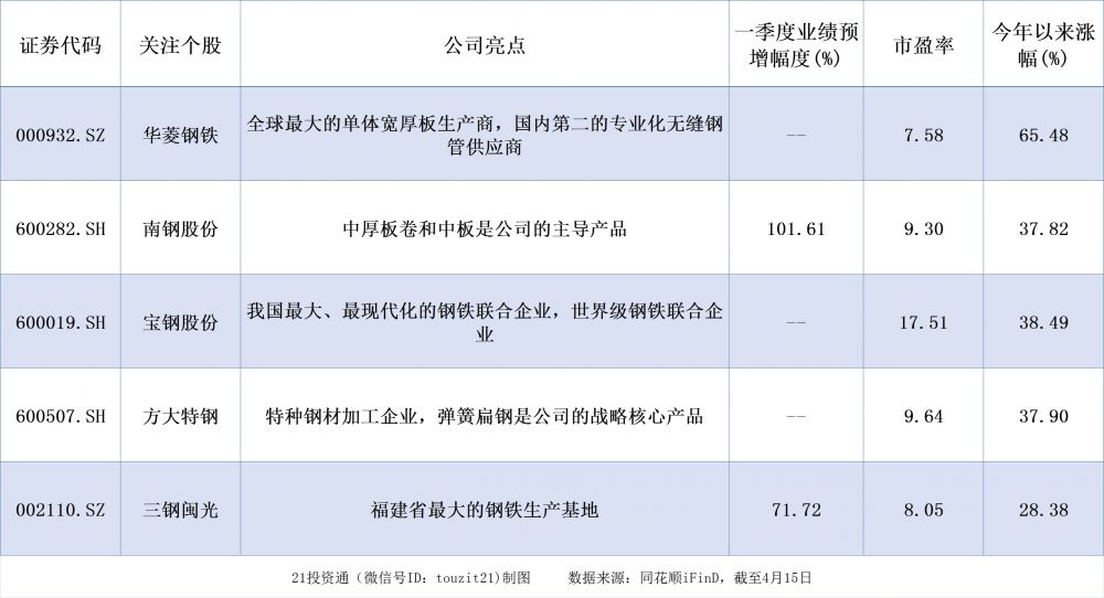 开源证券:关注一季报超预期的个股投资机会。由于2020年一季度受到疫情冲击,大多数上市公司业绩出现较大回落。而2021一季度由于大宗商品出现明显上涨,叠加销量增长,预计钢铁板块一季报增长明显。