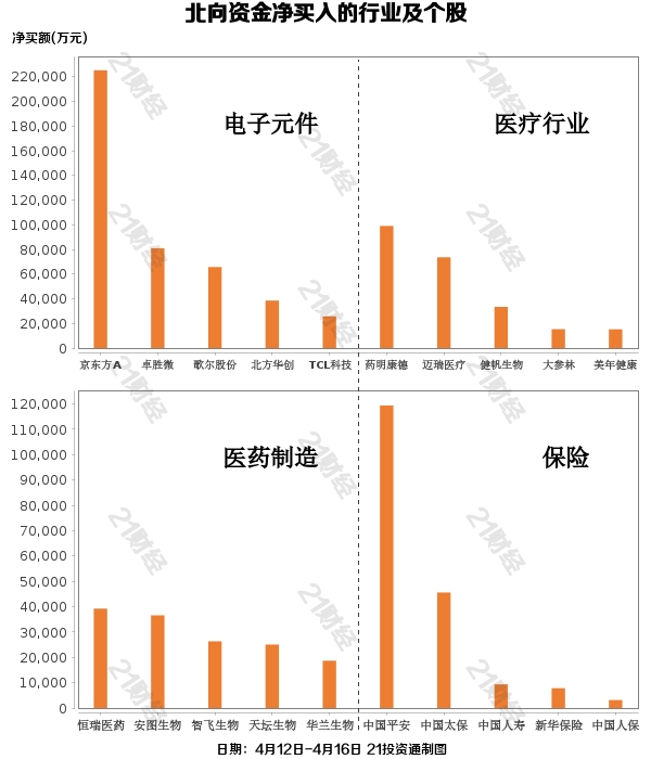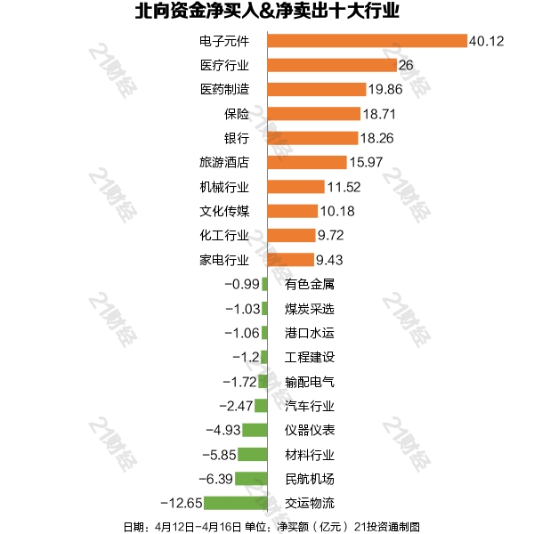 从净买入金额来看,北向资金增持了45个行业,其中电子元件居首,净买入金额达40.12亿元,其次是医疗行业,净买入26.00亿元。