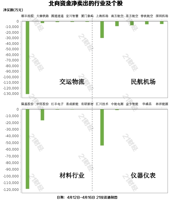 北向资金减持了15个行业,其中交运物流最多,净卖出金额达12.65亿元,其次是民航机场行业,净卖出6.39亿元。