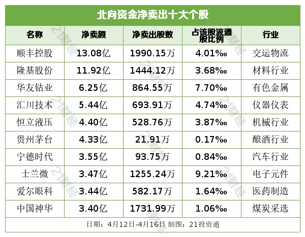 北向资金净卖出顺丰控股(002352.SZ)、隆基股份(601012.SH)、华友钴业(603799.SH)、汇川技术(300124.SZ)、恒立液压(601100.SH)居前,其中,顺丰控股被净卖出13.08亿元,隆基股份被净卖出11.92亿元,华友钴业被净卖出6.25亿元,汇川技术被净卖出5.44亿元,恒立液压被净卖出4.40亿元。
