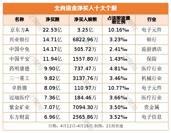 个股方面,北向资金净买入京东方A(000725.SZ)、兴业银行(601166.SH)、中国中免(601888.SH)、中国平安(601318.SH)、药明康德(603259.SH)居前,其中,京东方A被净买入22.53亿元,兴业银行被净买入14.71亿元,中国中免被净买入14.17亿元,中国平安被净买入11.94亿元,药明康德被净买入9.90亿元。
