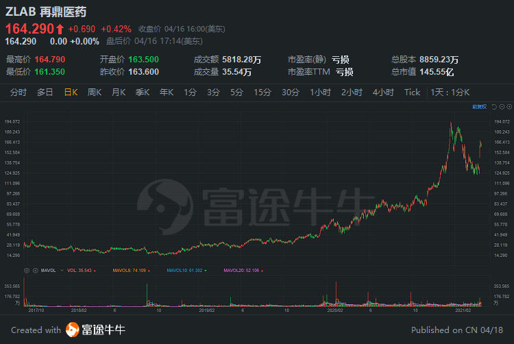 4月14日,天境生物宣布,其自主研发的、差异化的CD73抗体uliledlimab(也称为TJD5)的美国1期临床研究成果入选为美国临床肿瘤学会(ASCO)2021年年会壁报,当日股价上涨11%。Uliledlimab的全球临床开发目前已取得多项重大进展,详细数据将于2021年6月4日至8日ASCO年会上公布。