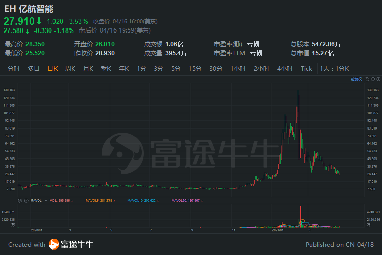 亿航智能:亿航智能2020财年续亏,周跌幅18.92%