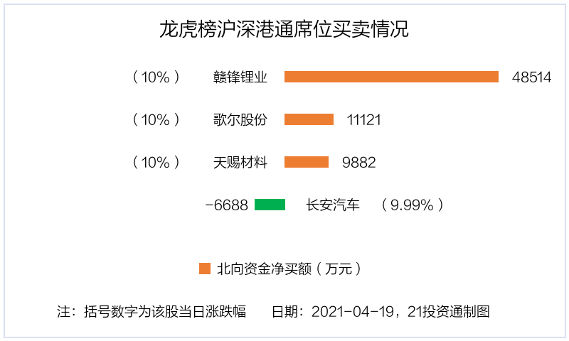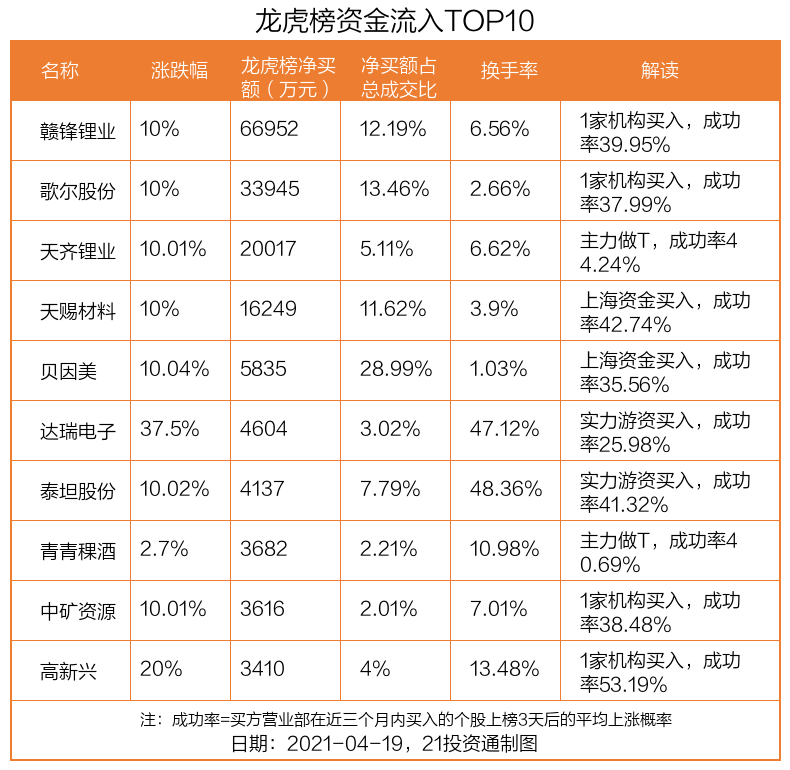 4月19日,上证指数上涨1.49%,深证成指上涨2.89%,创业板指上涨4.14%。盘后龙虎榜数据显示,共有49只个股因当日异动登上龙虎榜,资金净流入最多的是赣锋锂业(002460.SZ),达6.7亿元。