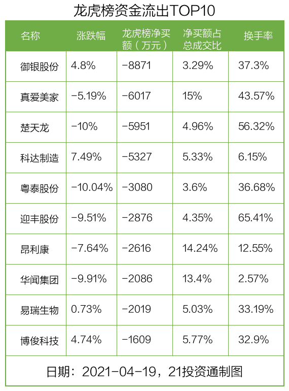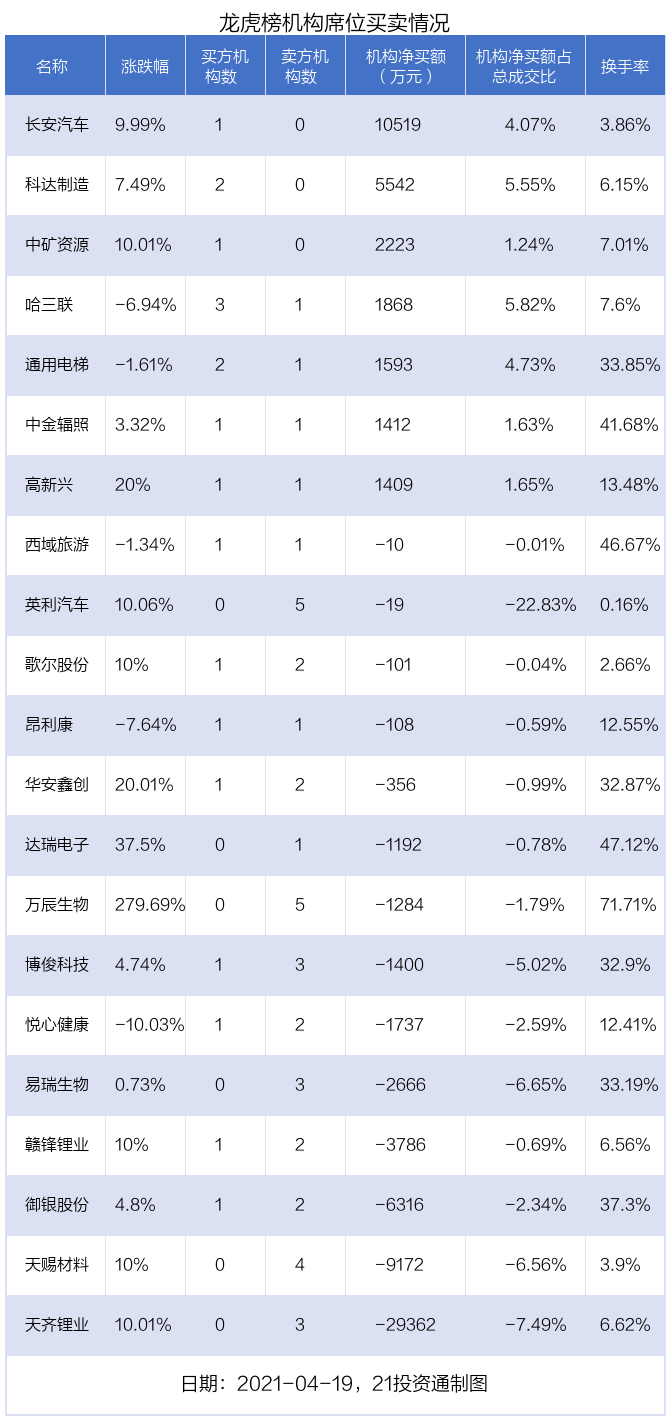 4月19日,21只个股龙虎榜出现了机构的身影,机构合计净卖出3.29亿元。具体来看,机构净买入7股,净卖出14股。