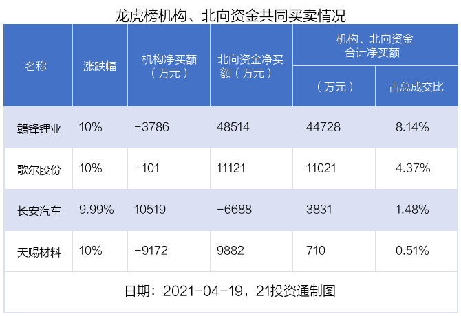 值得注意的是,机构和北向资金在赣锋锂业,歌尔股份,天赐材料,长安汽车上出现分歧,机构净卖出赣锋锂业3785.96万元,北向资金净买入4.85亿元;机构净买入长安汽车1.05亿元,北向资金净卖出6687.78万元。