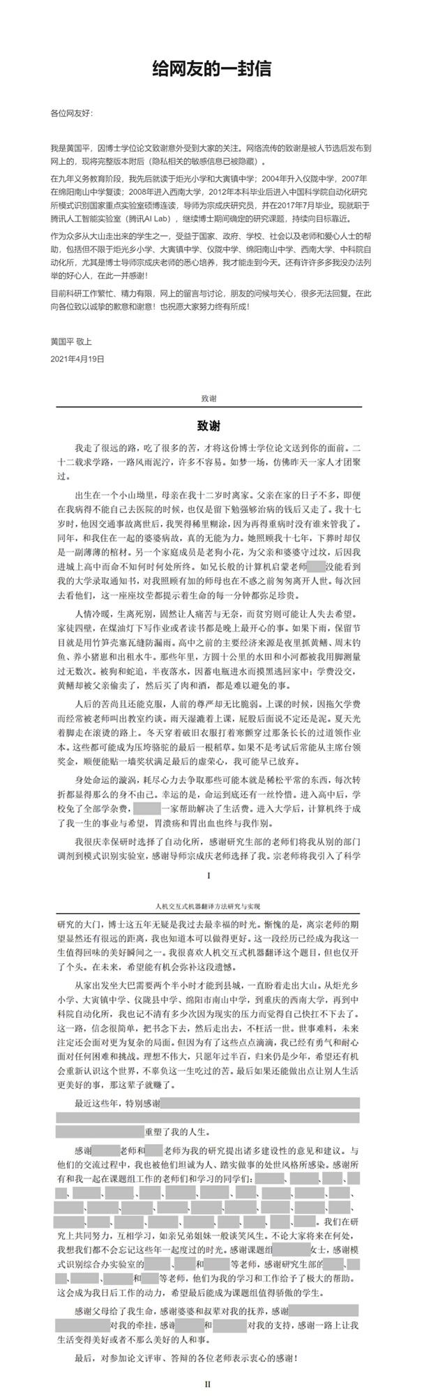 近日,中国科学院自动化所一博士论文的致谢部分在网上引发热议。作者黄国平回顾自己如何一路走出小山坳、和命运抗争的故事,打动了大批网友。