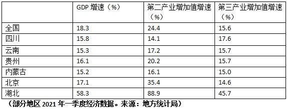 以医疗制造业为例,熊建中举例说,目前全国最大的疫苗生产地在北京,因此2021年一季度北京第二产业增加值受此的拉动作用明显,达到了35.4%,高于全国11个百分点。与之相对,四川省一季度的医疗制造业仅增长6.1%,处于相对低增长态势,对该省的第二产业增加值增速的带动作用并不强。
