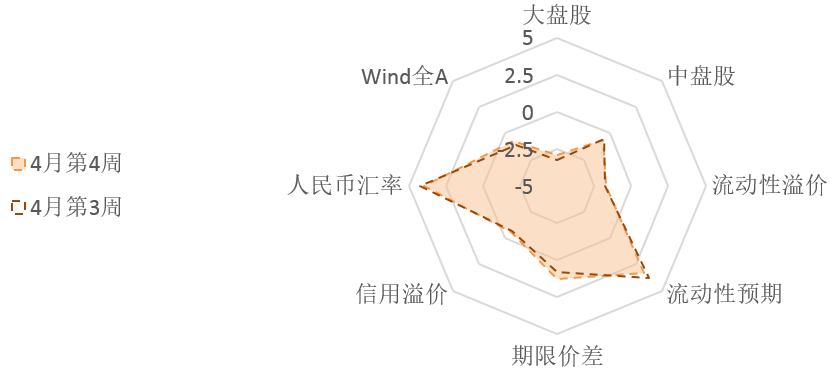 4月第3周,A股风险溢价小幅提升。整体估值依然【中性偏贵】(见图2),上证50的估值依然【贵】,沪深300的估值【较贵】,中证500的估值【中性偏贵】。成长估值【较便宜】,周期和金融的估值【中性略便宜】,消费的估值【中性】。大市值因子已经经历了较大幅度回调,但是仍有一定调整空间。