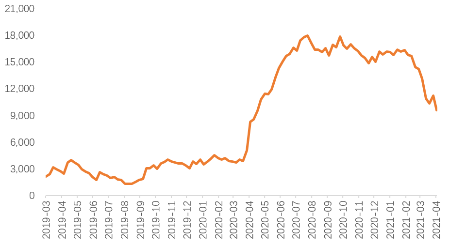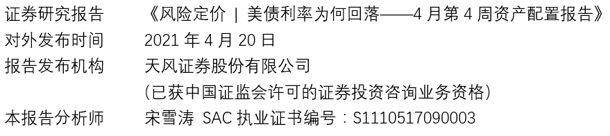 4月第3周,美国公布初次申领失业金人数创下疫情以来的新低,密歇根大学的消费者信心指数回升至去年3月疫情爆发前的水平。从数据来看,美国经济恢复的速度较快,但是目前美债实际利率重新回到3月初水平(-0.77%),回升速度放缓,美债名义利率经历了快速上行后已经在1.6-1.7%区间震荡了一个月左右。4月第3周,美债10Y利率降至1.59%,4月15日最低跌至1.53%,创去年11月以来最大盘中跌幅。