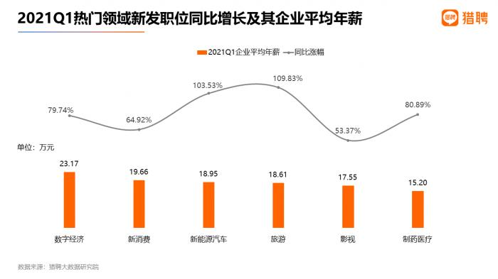从2021年一季度的六大热门领域——新能源汽车、旅游、影视、制药医疗、新消费、数字经济来看,各领域一季度的新发职位增长大体呈井喷趋势,新发职位同比增长均超50%。