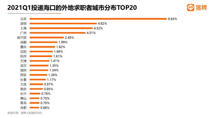 来自哪些城市的人才更青睐海口?《报告》显示,从一季度海南省外向海口投递简历的人才来源城市分布来看,北京位居第一,占比为9.83%。深圳、上海、广州位居第二、三、四位。有意思的是,在投递来源前20城市中,来自哈尔滨、大连等东北城市的中高端人才也较多,且排名较靠前。