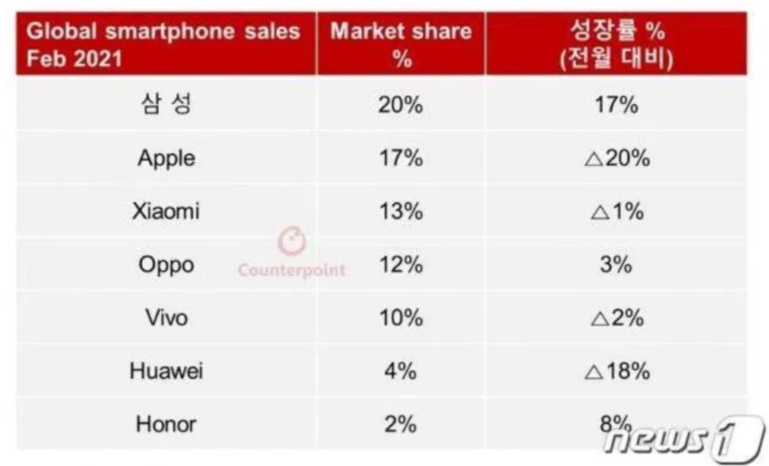 根据调研机构counterpoint近日公布的2021年2月份全球智能手机调查报告数据显示,荣耀目前全球市场份额仅占2%,排名第7,这或许是市场对荣耀目前产品线做出的最理性的回应。