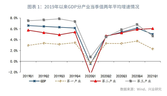 2021年3月GDP当季同比增速为18.3%,两年平均增速录得5.0%左右,较2020年第四季度有所下行。其中,第三产业的GDP两年平均增速则由6.8%降至4.7%,一定程度拖累GDP增长。